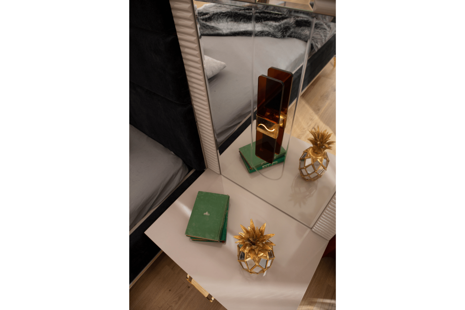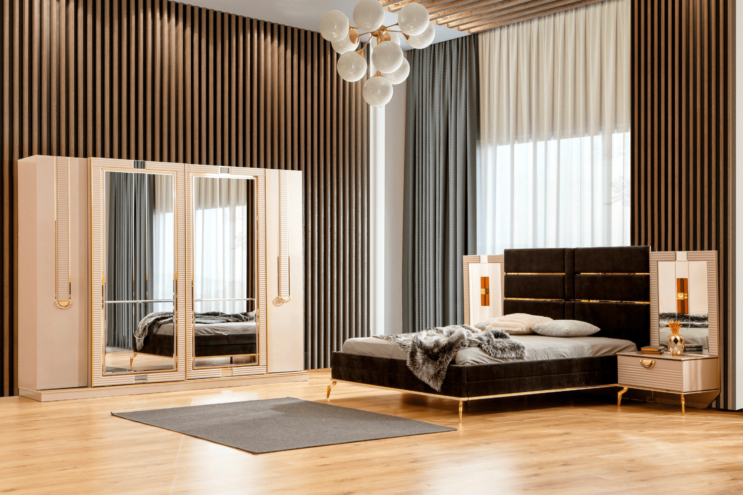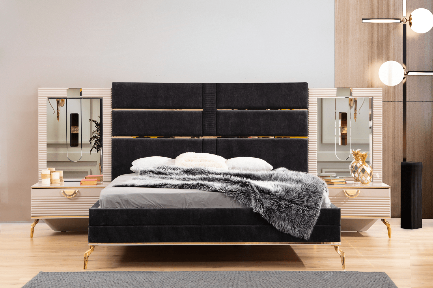 Illuminez votre chambre avec notre modèle de chambre complete Arya composée d’un lit coffre, d’une armoire, de deux chevets et d’une commode avec miroir.