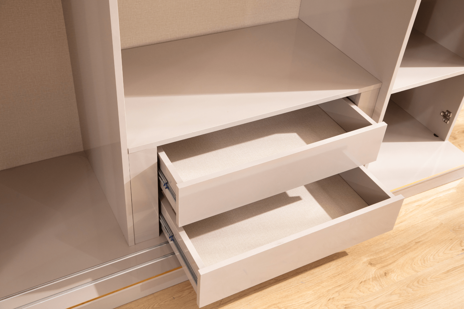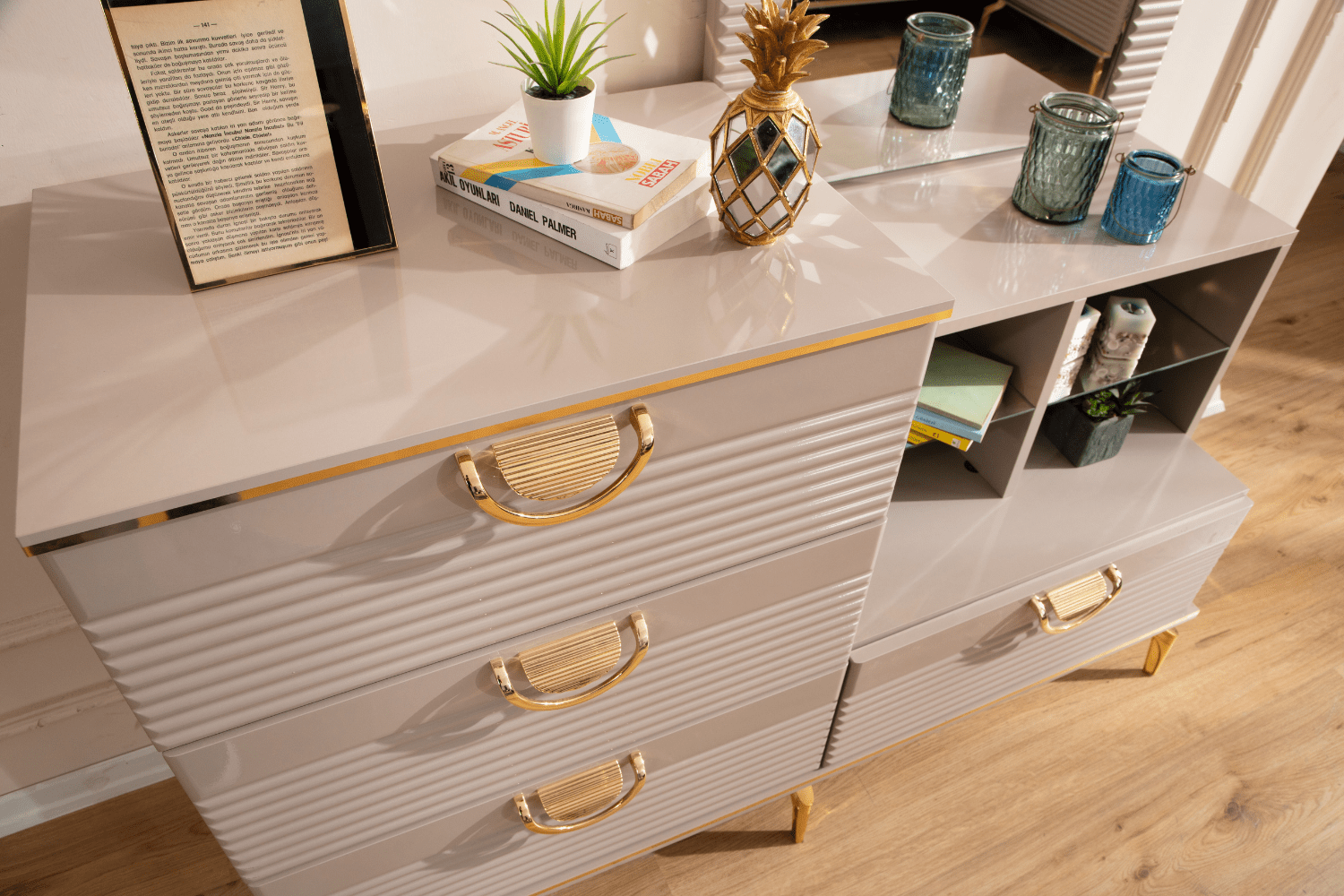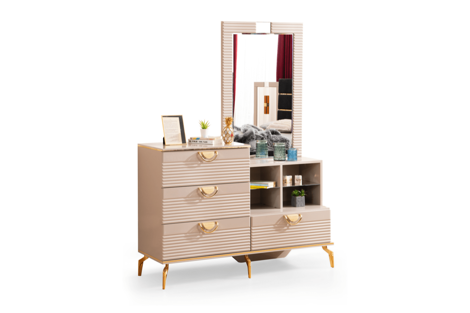 Illuminez votre chambre avec notre modèle de chambre complete Arya composée d’un lit coffre, d’une armoire, de deux chevets et d’une commode avec miroir.