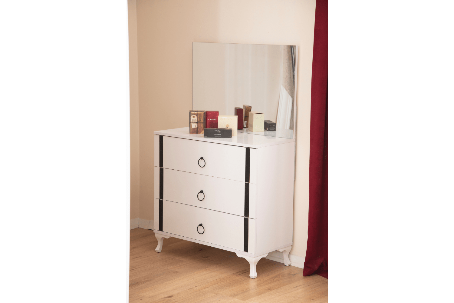 Commode avec miroir : 145 cm (hauteur) x 90 (largeur) x 41 (profondeur)