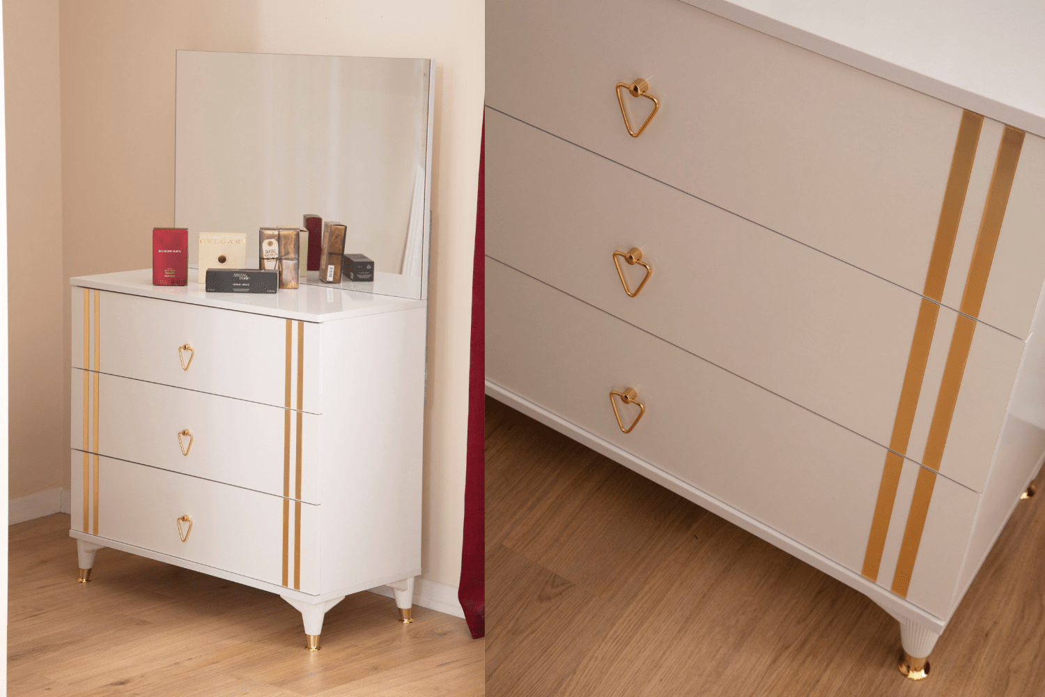 Commode avec miroir : 145 cm (hauteur) x 80 (largeur) x 41 (profondeur)