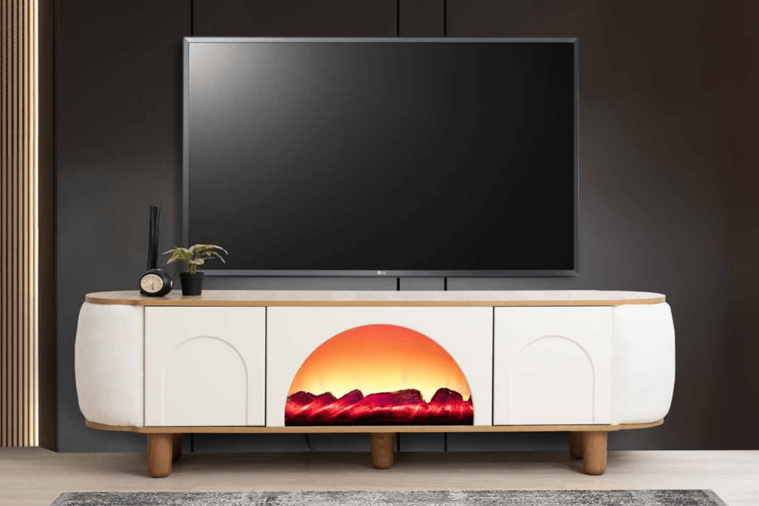 Apportez modernité et chaleur à votre salon avec le meuble télé Mostar blanc avec détails en bois clair. Ce meuble est équipé d’une enceinte Bluetooth et d’une cheminée LED réglable via télécommande, vous permettant de créer une ambiance chaleureuse et personnalisée selon vos envies. Son design élégant et ses matériaux de qualité en font un choix parfait pour un intérieur à la fois chic et fonctionnel.